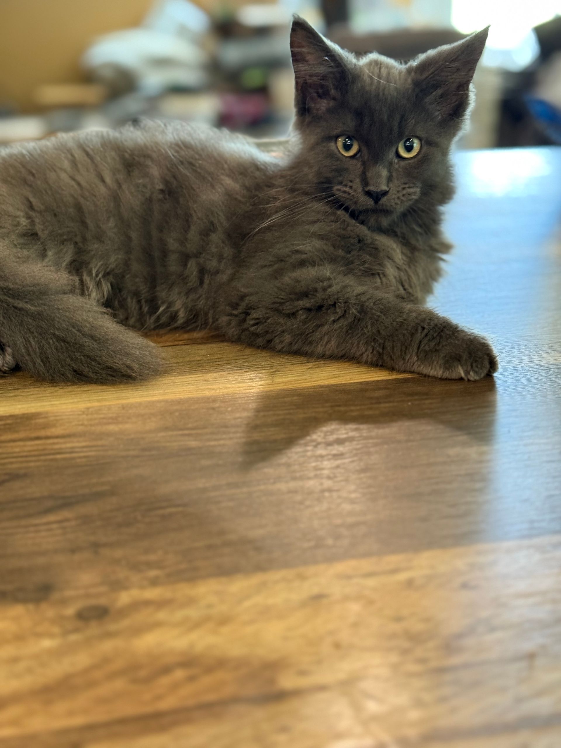 Bella is a Female Blue Maine Coon Kitten. Bella has a wonderful temperment and would make someone that loves to spend time playing with and laughing at the crazy things she plays with would love to be her new companion. She enjoys couch time and playing with the ball chase toys along with her ever faithful play springs.